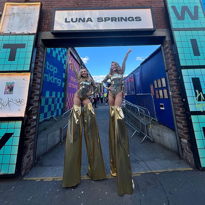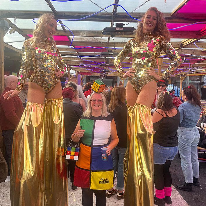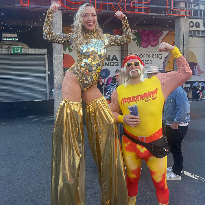 Iconic 80s-themed stilt walkers dressed in glamorous gold costumes bring a funky retro feel to events