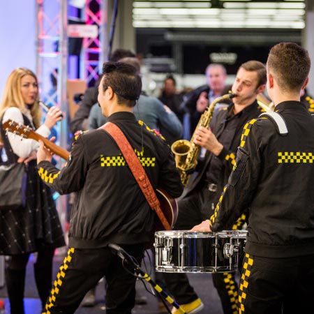Our interactive band is happy to customise their outfits for marketing purposes, including added branding or logos, to help increase brand awareness