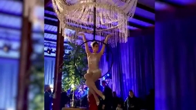A gorgeous and unique aerial apparatus that will take your event to the next next level of luxury. Watch as a beautiful aerialist dangles underneath this giant aerial chandelier, performing captivating routines that create an air of elegance.
