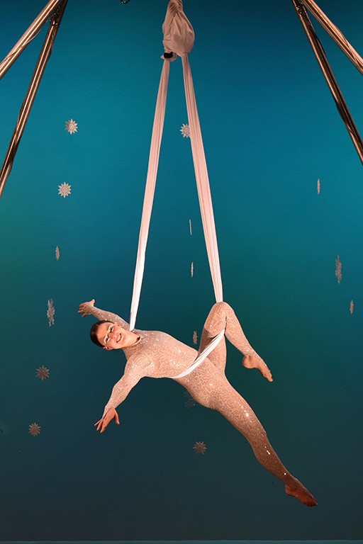 They also perform on cocoons, a single loop of fabric. Cocoons are fantastic for meet and greet and main acts, allowing the performer to stay in the air for longer periods of time than other types of equipment. They bring a dramatic sense of visual height with the performer completely separated from the ground, and therefore also work well in lower venues.
