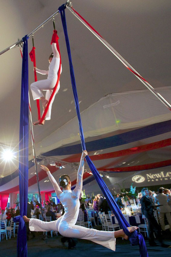 Adding rich colour to any space, a silks act not only brings beauty but also drama. Choreographed with exciting drops and stunning aerial dance fluidity aerial silks is a mesmerising and elegant act.