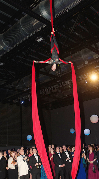 Aerial champagne pouring as part of an evening of aerial dance and circus.