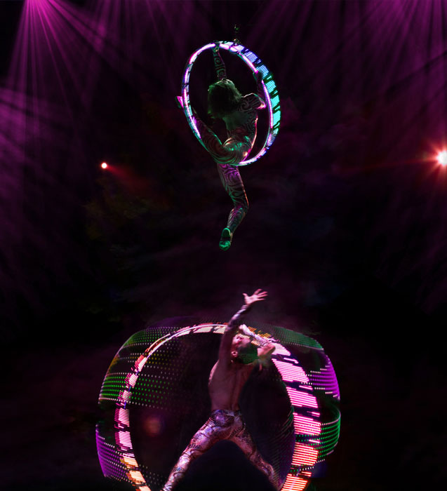 These circus performers in Mexico have a range of skills that includes the cyr wheel, cube juggling and LED aerial hoop.