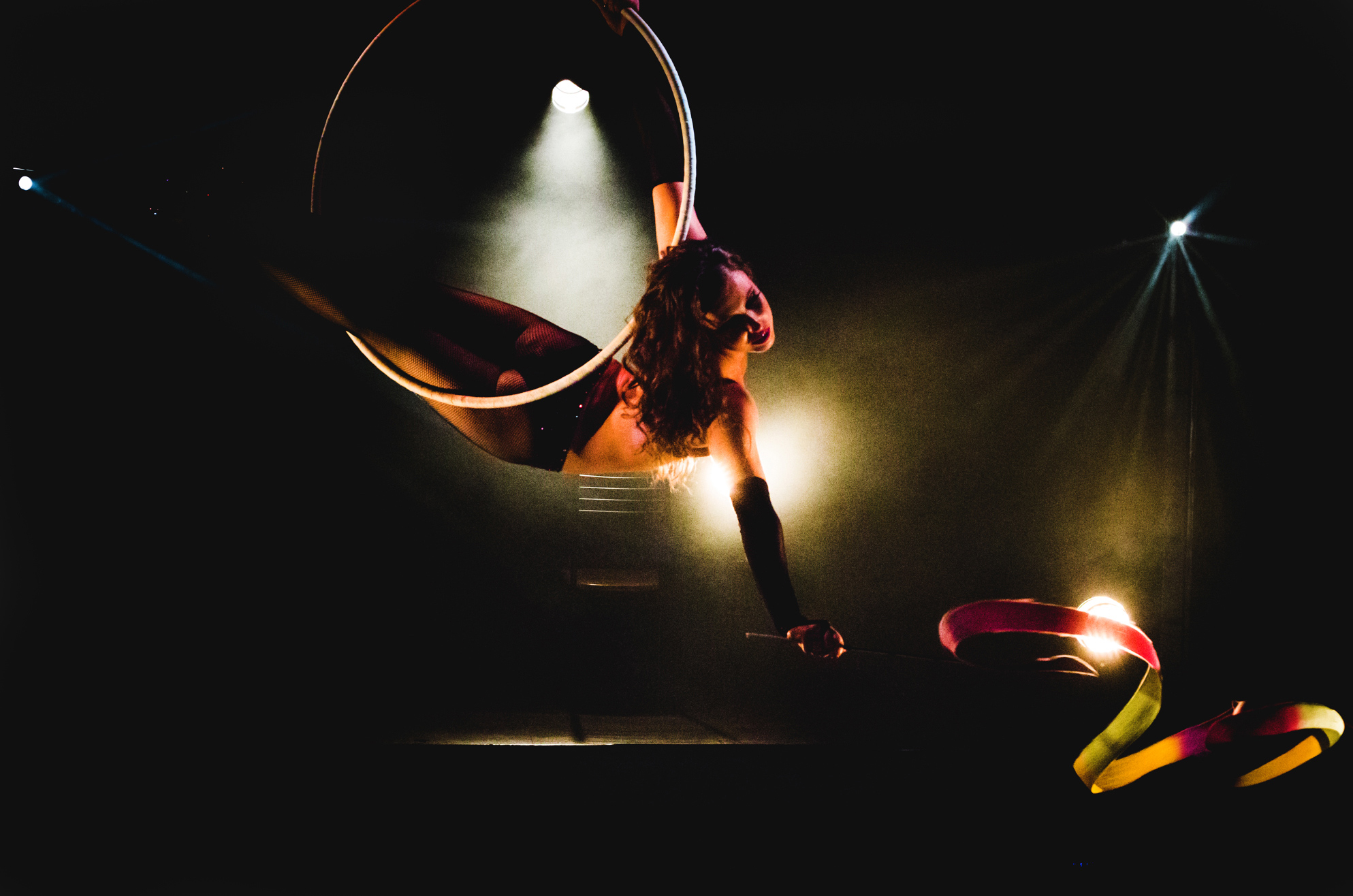 Fuelled by passion, energy and elegance, the cabaret performer’s act is soundtracked by a remix John Powell’s Assassin’s Tango. A dramatic piece of music that adds energy and an air of romance to the aerial show. The burlesque performer takes to the stage in a seductive outfit with a purple wig and ring master style top hat. She proceeds to whip off the hat and wig mid-flight, as she takes to the aerial hoop act, revealing her true character. the performance continues with the introduction of the ribbon dance which she takes to the hoop for ma beautiful aerial act.