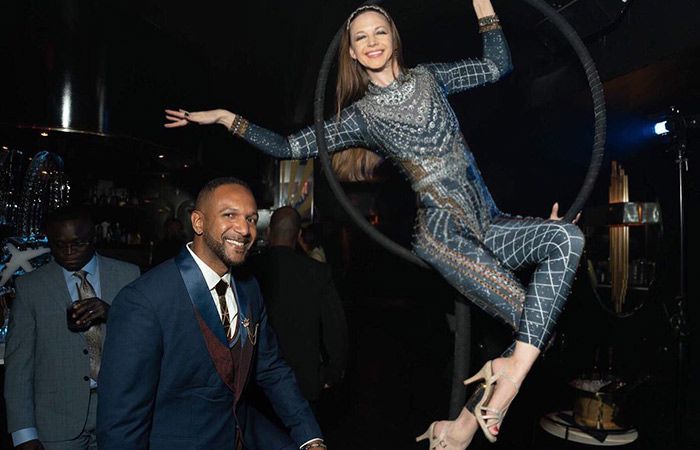 She can perform choreographed routines, ambient sets and even an interactive champagne aerial where she pours drinks from her lollipop lyra rig
