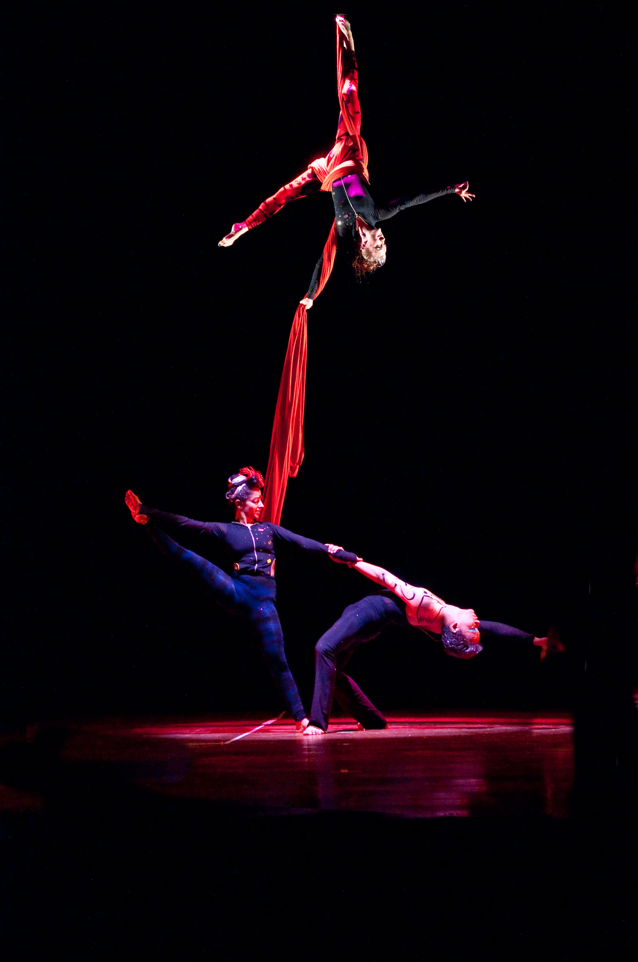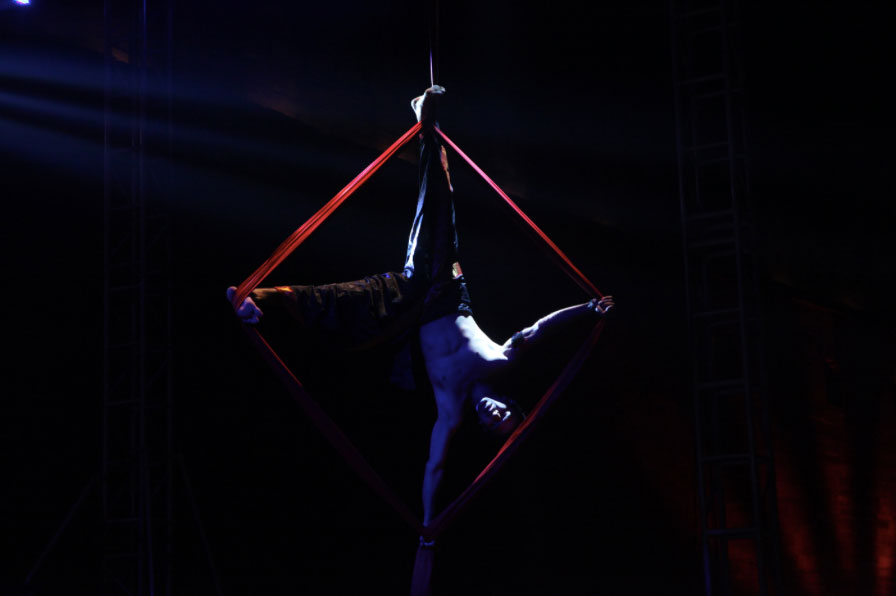 Aerial Silks is a performance art where one or more artists perform acrobatics while hanging from a silken fabric. The artists climb the suspended fabric without the use of safety lines, and rely only on their training and skill to ensure safety. They use the fabric to wrap, suspend, fall, swing, and spiral their bodies into and out of various positions.