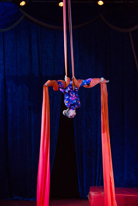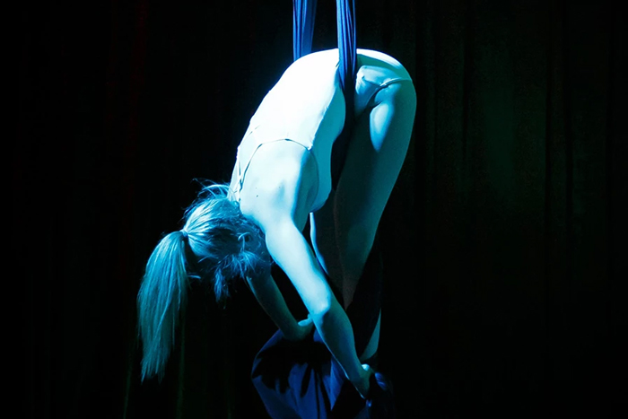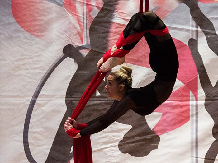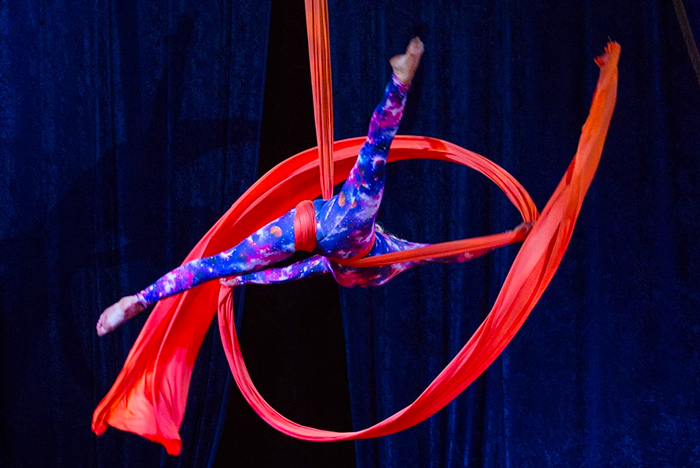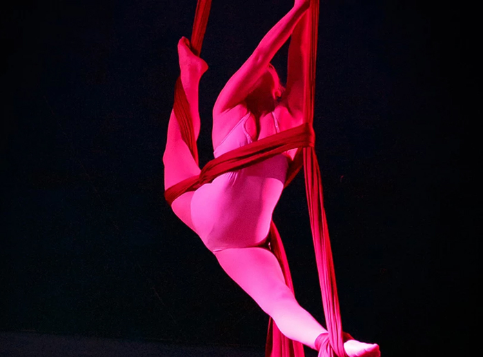 Aerialist combines the graceful elegance of aerial silks with breathtaking acrobatics intertwined in a superb choreography