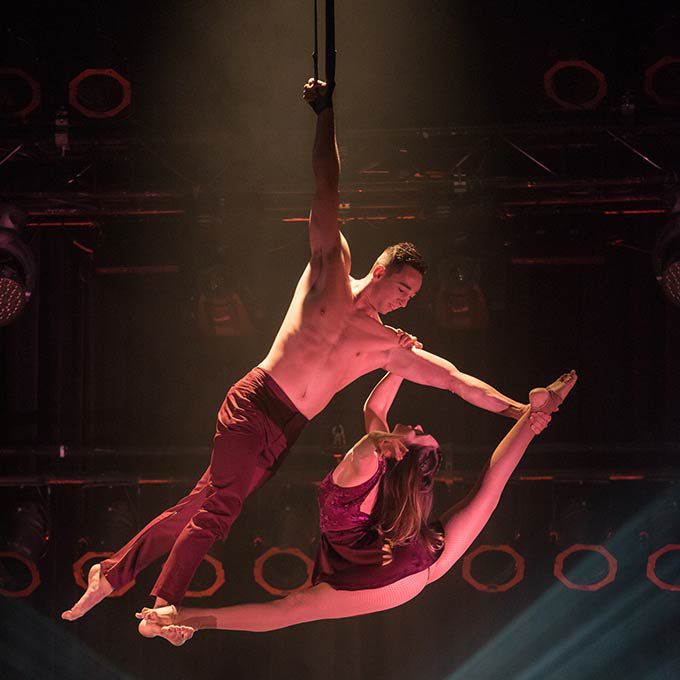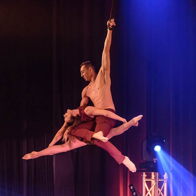 These artists create strong visuals in their aerial straps act, providing spectacular circus entertainment for corporate and private gatherings