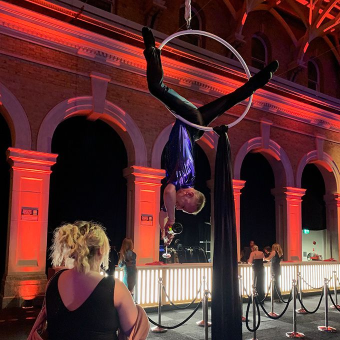 Needing minimal rigging to perform, you can even book our festive champagne aerialist to perform in low venues and marquees.
