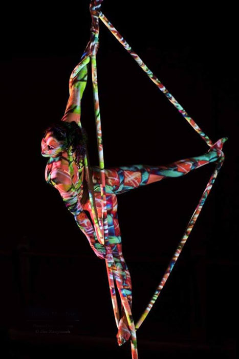 The multi-dexterous circus artist is also available as an aerialist to provide mesmerising shows with the cyr wheel.