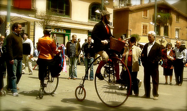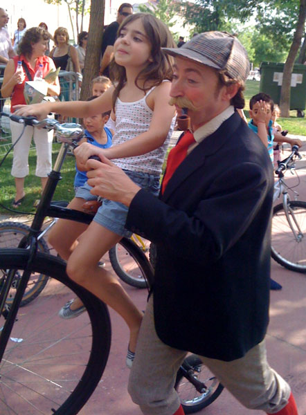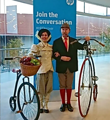Enthusiastic penny farthing riders, these historical characters were out for a jaunt one day when they travelled through a time tunnel, and now have no idea which time period they’ve ended up in! Watch in amusement as these remarkable walkabout performers gaze in wonder at the 21st century architecture, vehicles, and people, trying to work out where they are whilst all the while riding their antique bicycles.