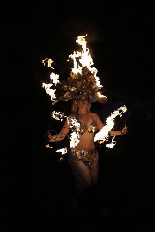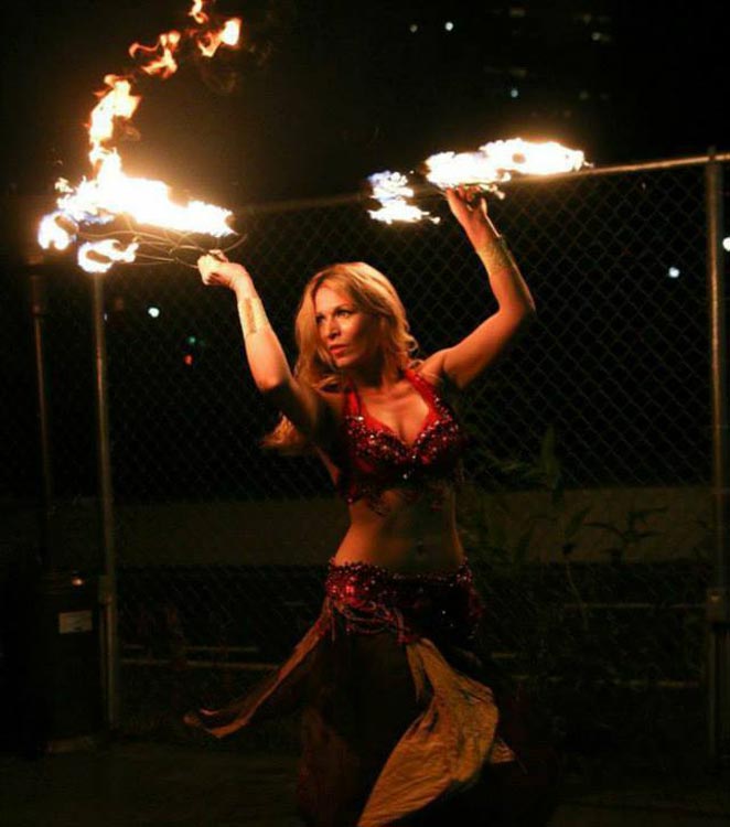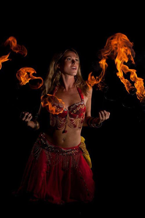 Our multi-talented performer can be booked as a fire performer with fire fans and flaming contact juggling as well as non fire characters that perform contact juggling and belly dancing.