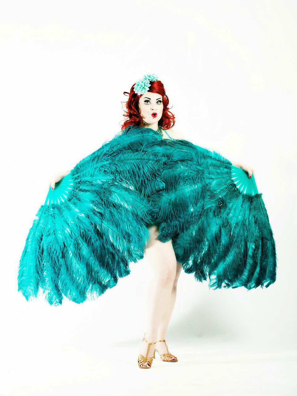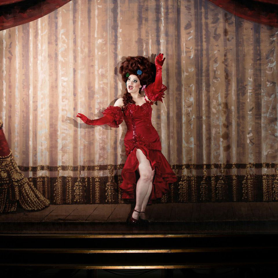 She brings humour, a somewhat drag drama queen feeling, and a big sparkle of glamour to classic burlesque, mixing her dance with a hint of neo burlesque style.