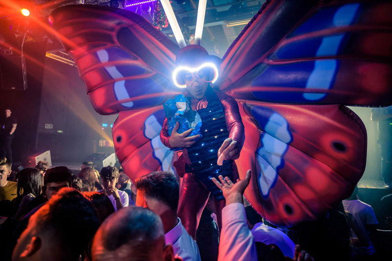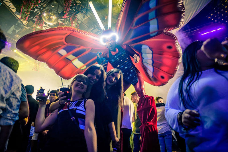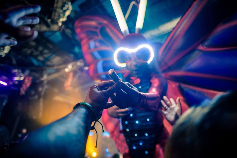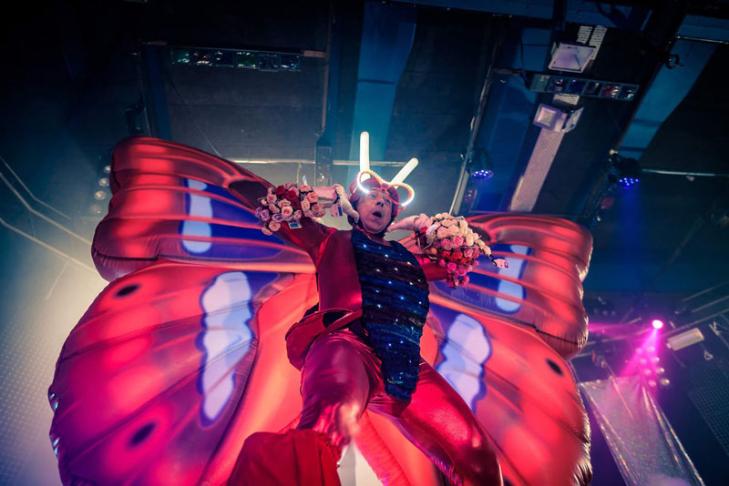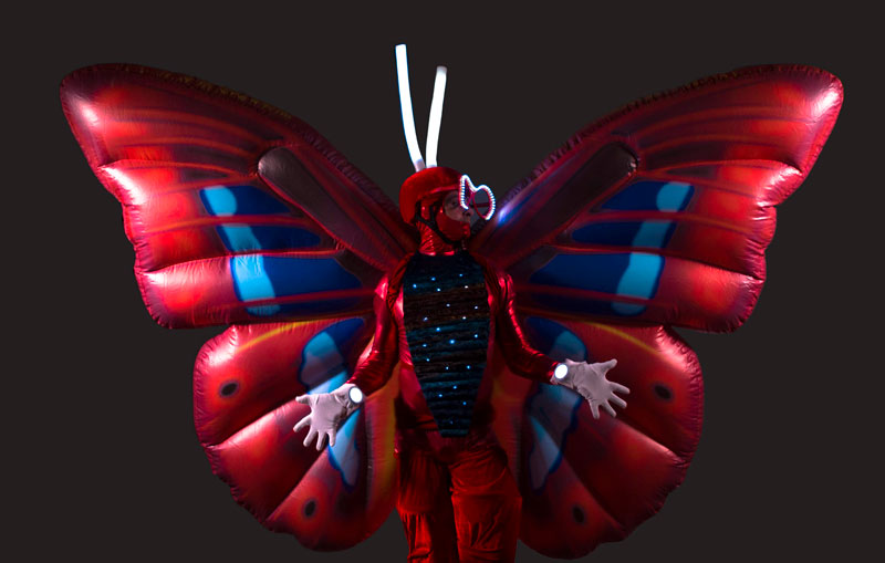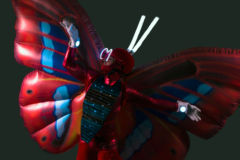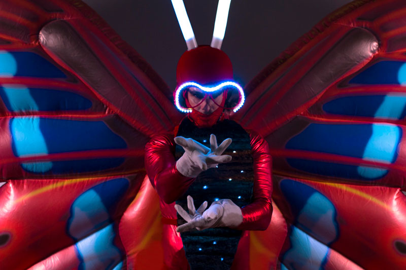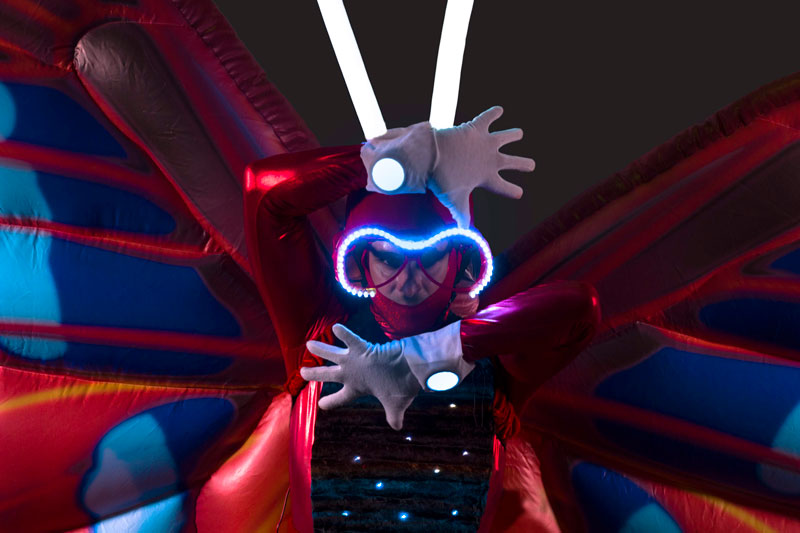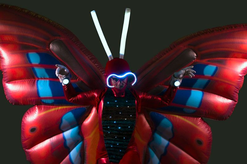 The vibrant and eye catching butterflies on stilts are generally hired as stilt walkers but available to perform without the stilts too. Your event venue may be restricted on height but this option means you won’t lose the visual impact. The walkabout act is incredible versatile and can offer you interactive entertainment at a variety of events and occasions. Indoor or outdoor, daytime or nighttime. In fact, they are a fantastic choice for evening or night time events as they come with some amazing in-built lights that really make them stand out.