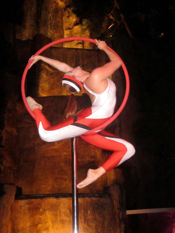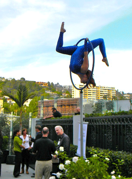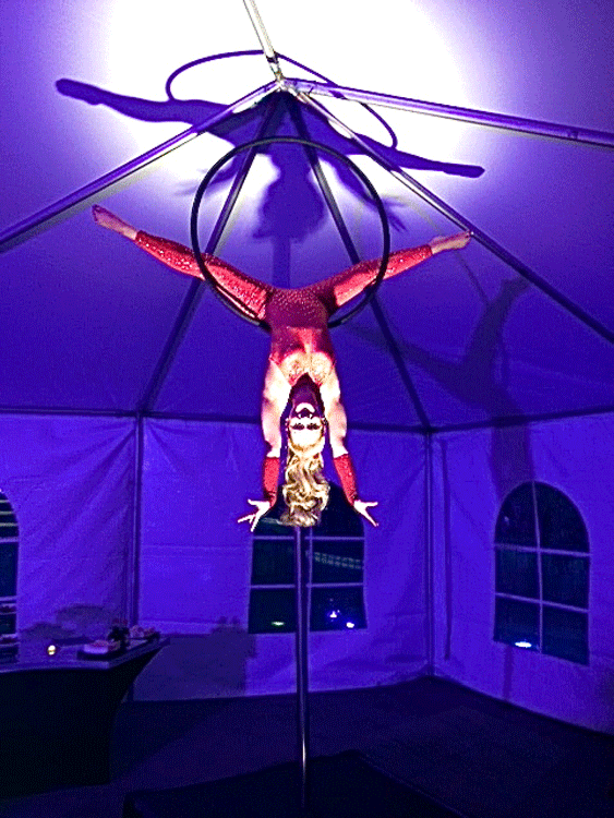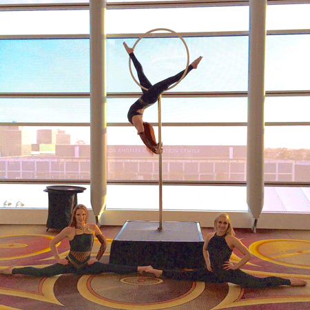 Performing ambient routines from their pole hoop our California Lollipop Aerialists weave in and out of their hoop, performing stunning poses and acrobatics from above.