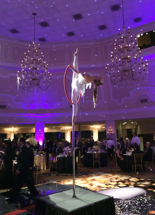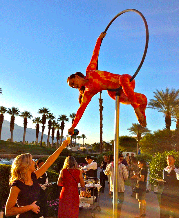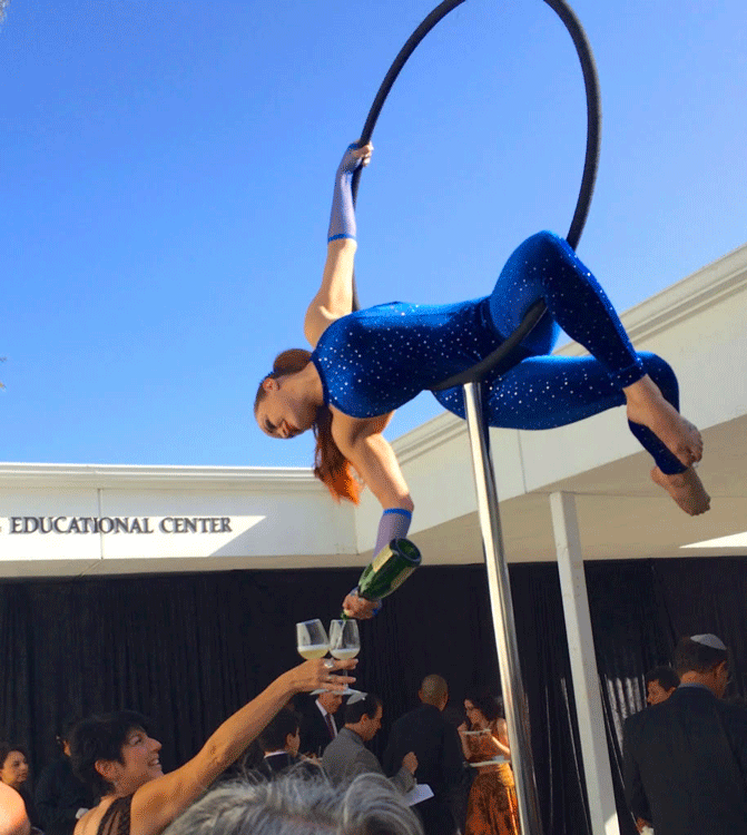 In addition to performing outstanding aerial routines our event aerialists can be booked as champagne serves, waiting on your guests and pouring their drinks from their pole hoop making for interactive event entertainment that goes above and beyond for exquisite service.
