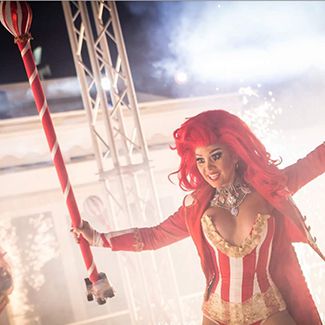 Choose performers from various disciplines, including stilt walking, aerial acrobatics, candy ladies with a cart, bubble and fire performers