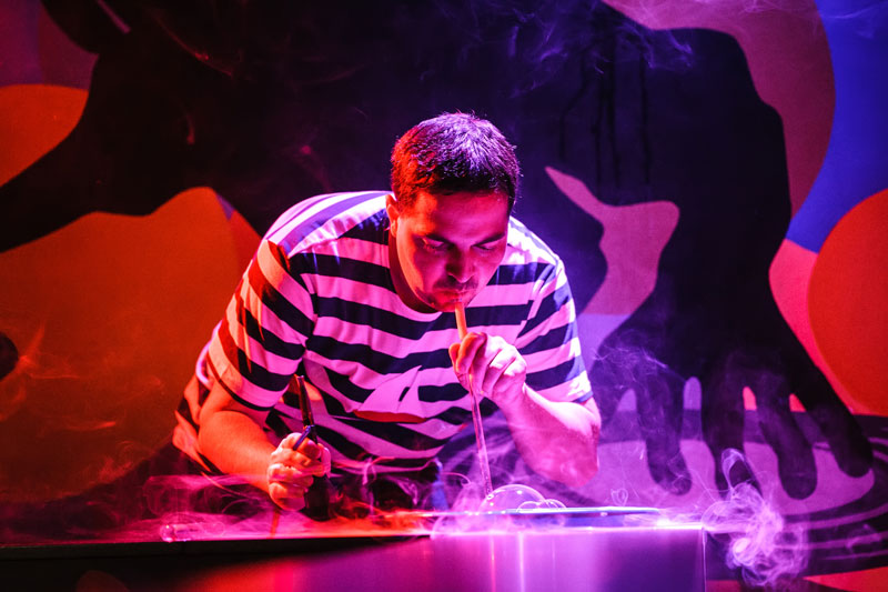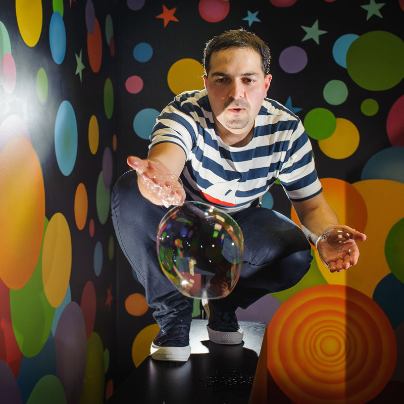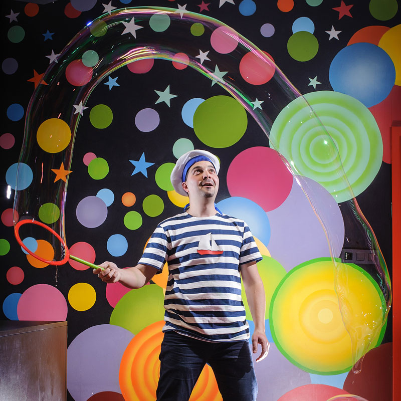 A very interactive children’s bubble show, kids are an essential part of this spectacle! Charming and outgoing, our entertainer will quickly connect with his audience with his friendly approach. Once the child’s confidence is won over, he will ask some of them to join him on stage to ‘help’ him perform some of his tricks.