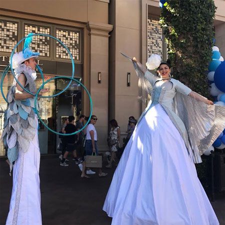 Already an eye-catching spectacle as they tower above guests they can also perform with unique props, such as fire juggling clubs and LED hula hoops