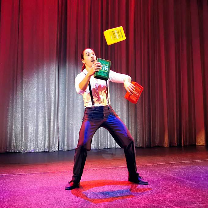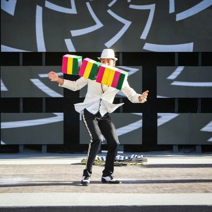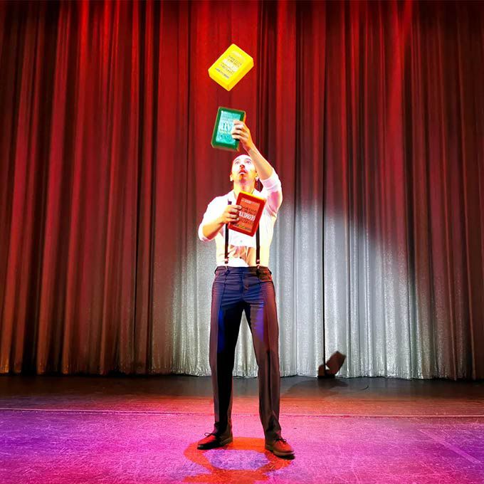 Our talented circus artist performs a unique juggling act where he juggles multiple cigar cartons for a captivating themed act