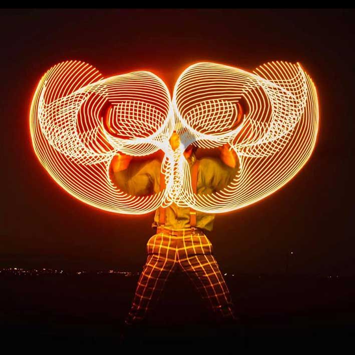 With LED elements, his act is perfect for low-light or nighttime performances; ideal for festivals, corporate events, shopping malls, and parties