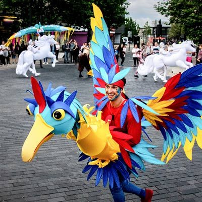 Our big bird puppets are based in the UK and make the perfect character addition to parades, tropical themed events, festivals, carnivals and more