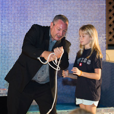 A comedy act that includes appearing and disappearing objects, pulling 50 feet of paper out of his mouth, performing magic tricks blind folded, cutting rope and then magically joining it back together, reading minds and then to finish the show our children’s entertainment makes the birthday child feel extra special as they perform a miracle of linking metal rings together.