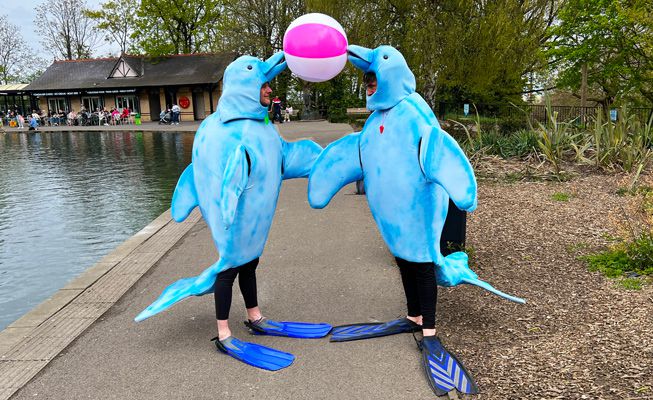 This playful walkabout act featuring two comedy dolphins brings laughter and lively interaction to guests of all ages