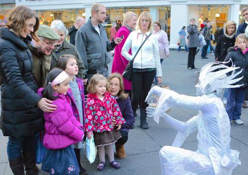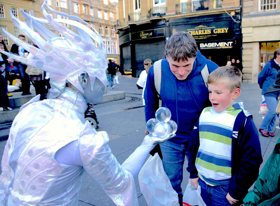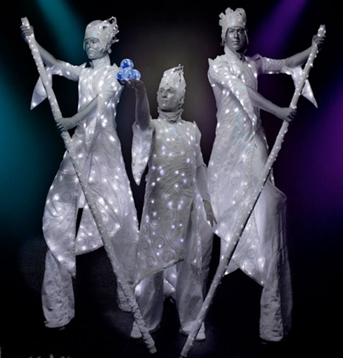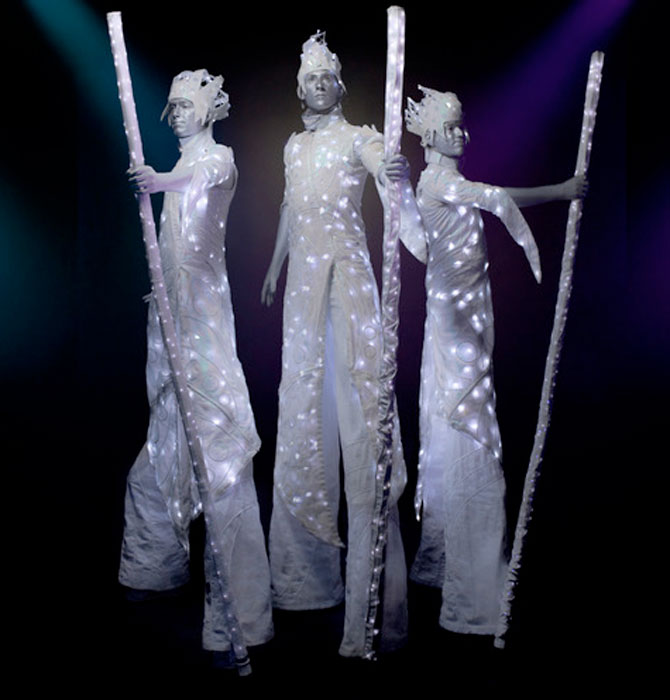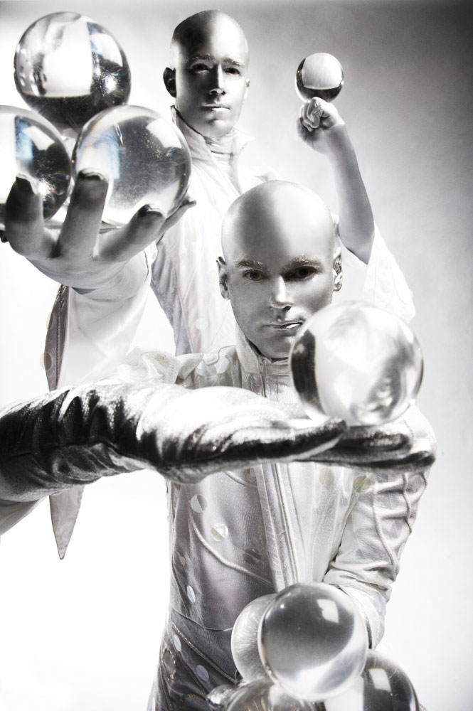 Glass balls appear suspended in mid-air, unusually tall characters freeze and move in enigmatic synchronicity, and a magical soundscape surrounds them all. Calvos appear as either ground level crystal ball jugglers or stilt characters - or both - in the same booking...