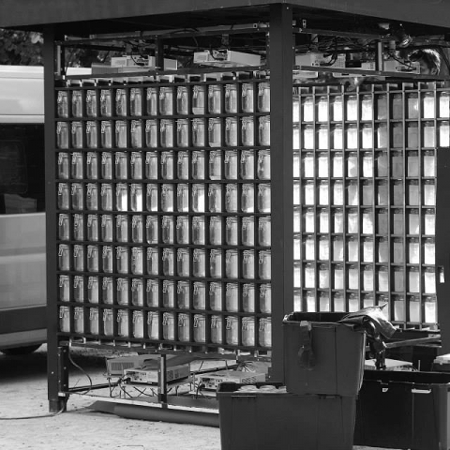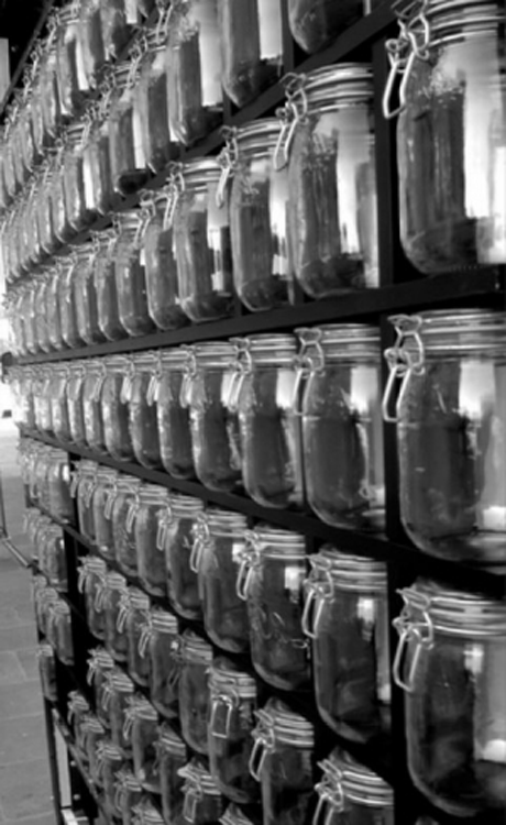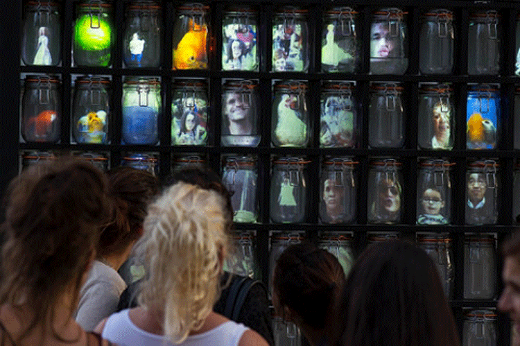 A collection of 448 jars aligned and stacked with 16 video projectors giving the illusion that a creature is enclosed in each jar