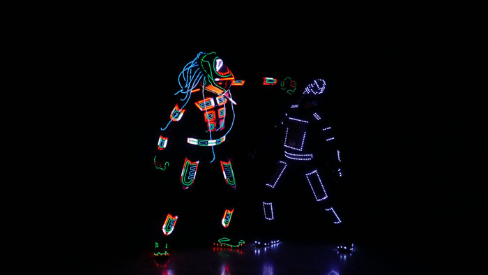 Our Customisable LED Dancers Asia have developed a brilliant concept that means each and every single performance is completely unique and tailorable to client specifics. The futuristic LED costumes have state of the art chest pieces that can include letters, logos or slogans that can be programmed and sequenced into the choreographies. Choice of music, dance routines and colour selections can also be completely bespoke upon request.