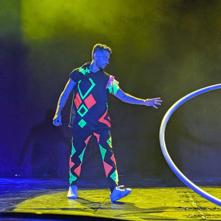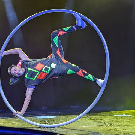 This Cyr wheel artist delivers a captivating display of balance, control and strength, spinning effortlessly across the stage at high speed