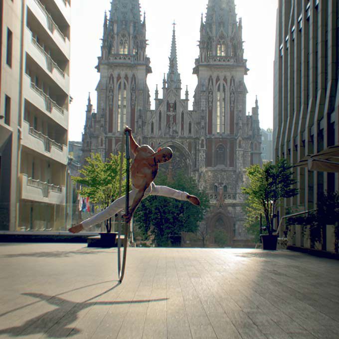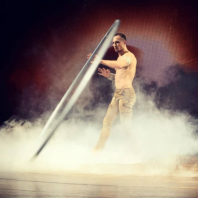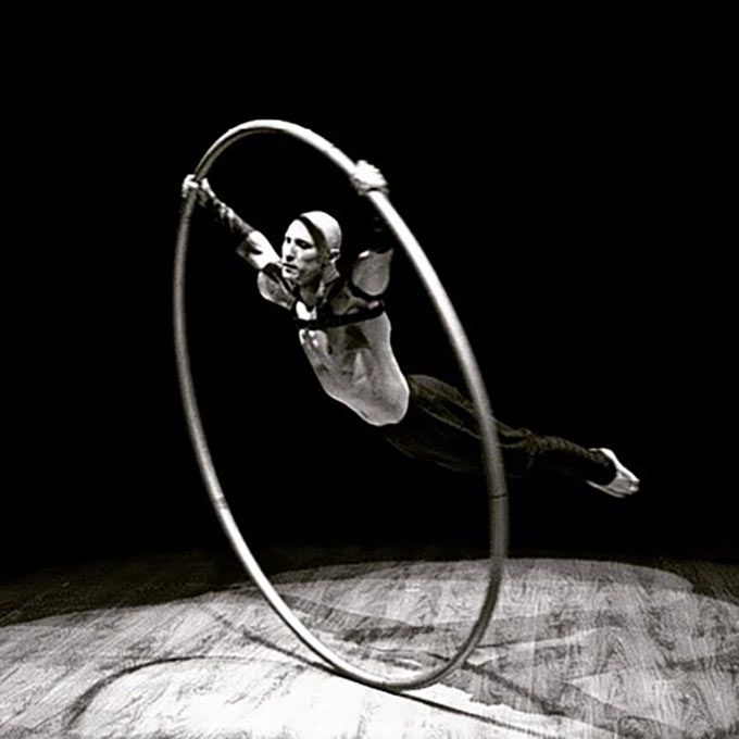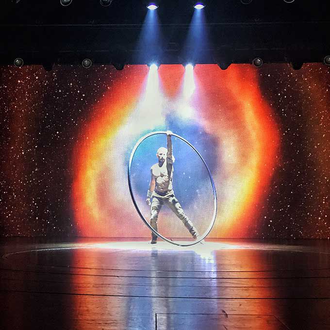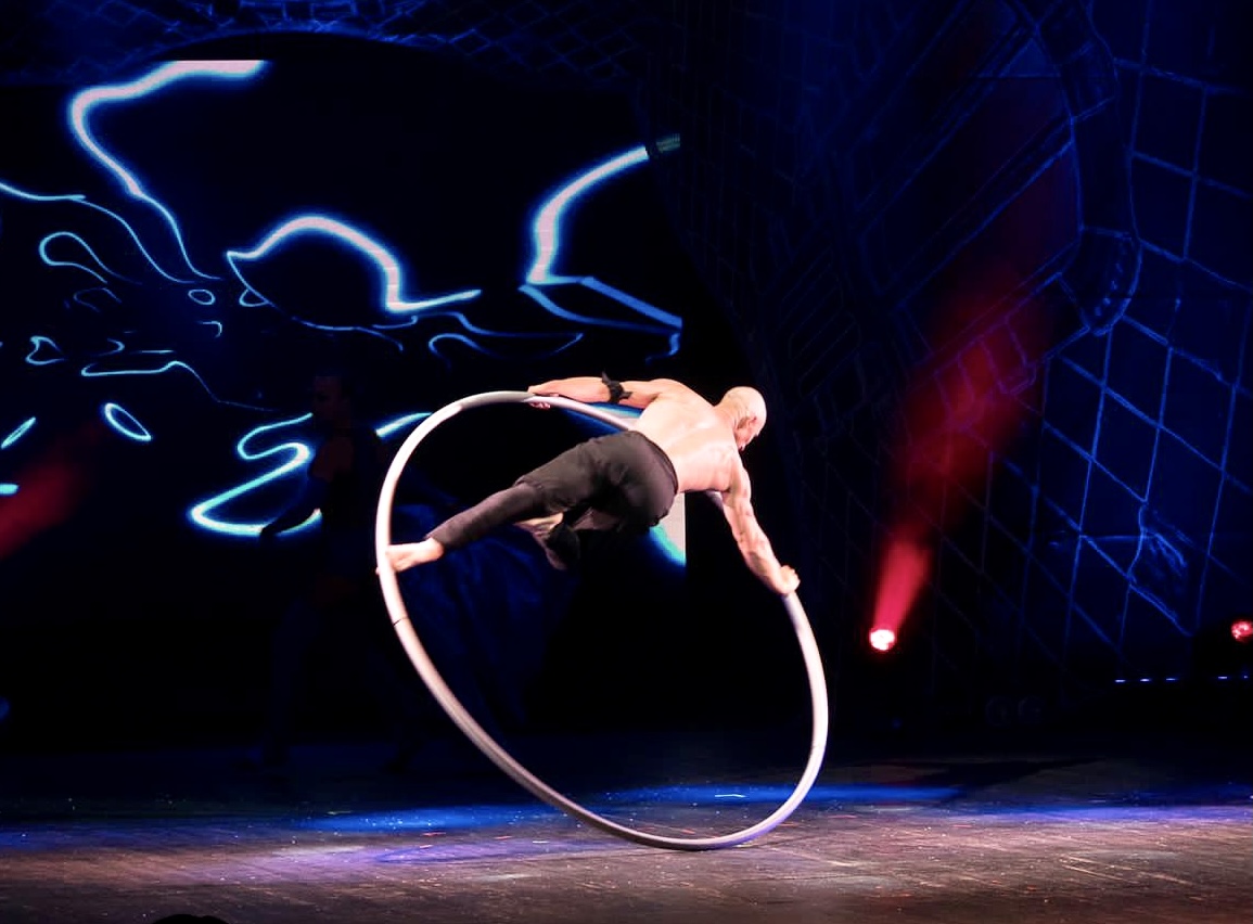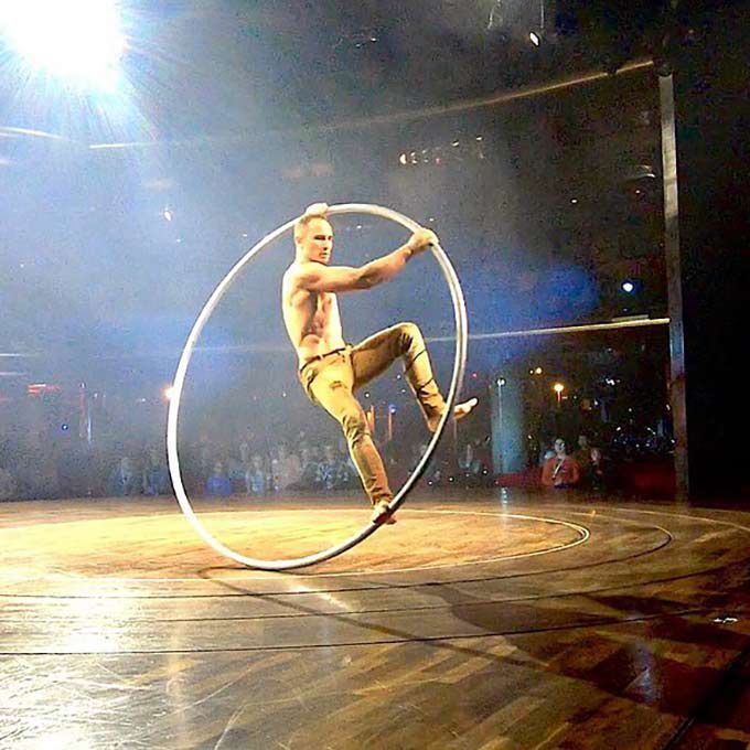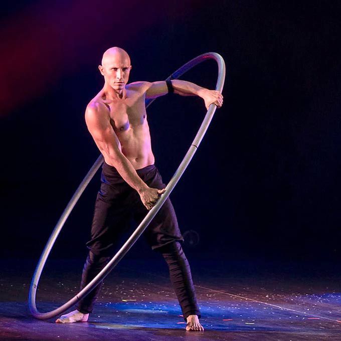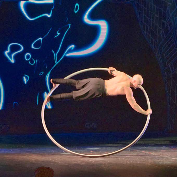Our acrobat creates a gripping visual story in his Cyr wheel act by incorporating a stunning soundtrack into his performances