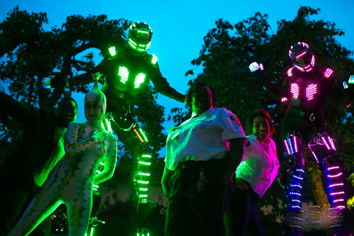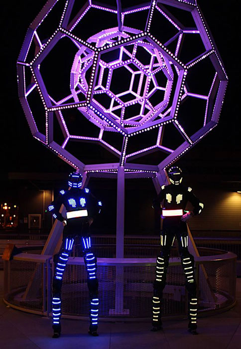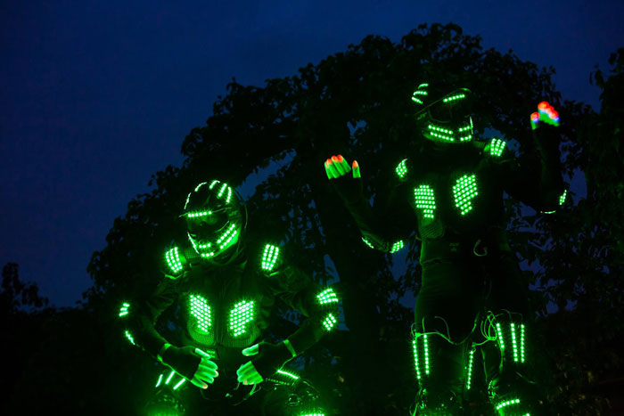 The LED dancers are a dazzling walkabout act that can bring a bit of fun to your party. They are best suited to night time events or where the lighting can be made dark as this makes their robotic costumes stand out.