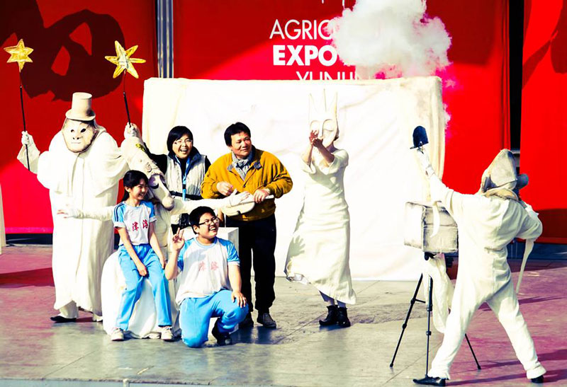 The performance sees the white characters parade with a cart along a given route to their pre-determined final destination. They then entertain the guests with comedy, a love story and crowd interaction. A white angel creates bubbles through a badminton racket whilst a white Queen tries to catch them in a small net. They end with a fascinating character coming out and playing the violin. At this point, members of the audience are encouraged to come and join in with customised white violins props! The show can be adapted into an evening performance. This would see the addition of lighting and Chinese lanterns along the parade. A white lady will interact with members of the crowd and involve them in a game of lamps and mirrors. A totally unique act that will make a long lasting impression.