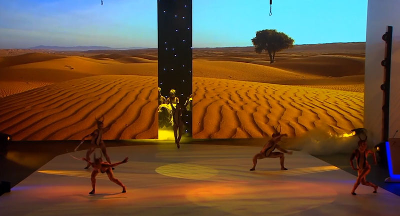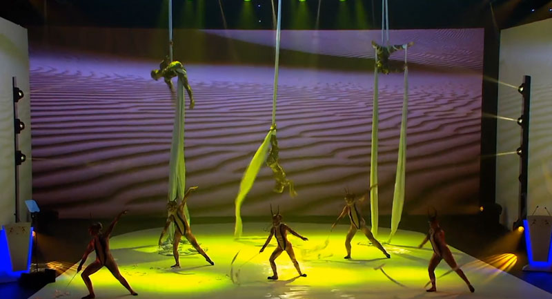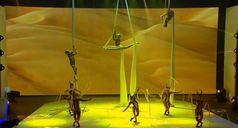 The Desert Show’s powerful performances conjures up imagery of wild dynamic beasts and the barren, but delicate nature of a Savannah. Brought to life through delicate ballet choreography and daring aerial performances showing off the acrobats power and grace.
