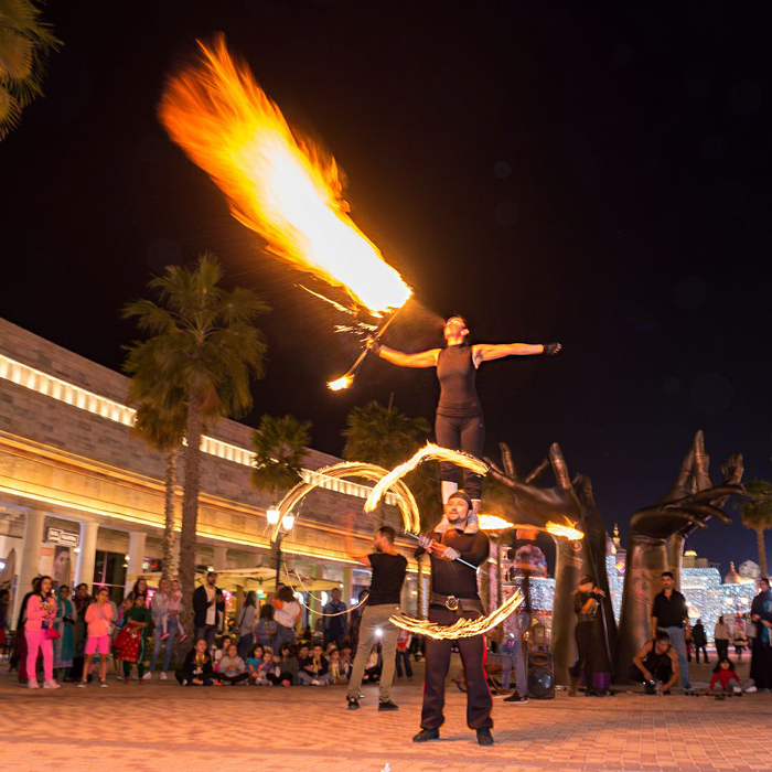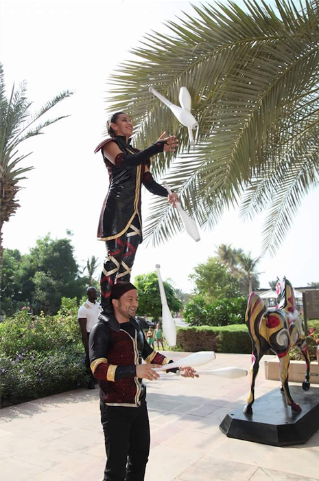 The Dubai Circus Duo is able to provide acts with juggling, fire performances, acro balance, and acrobatic stilt shows. These Dubai circus performers are extremely versatile and will accommodate any location and event type. They have a range of costumes ready to be tailored to any event theme and have plenty of experience being involved with Christmas festivities, shopping malls and any event that requires family-friendly entertainment.