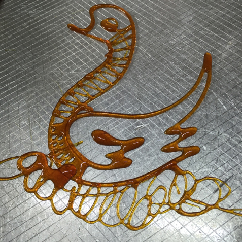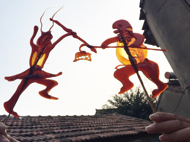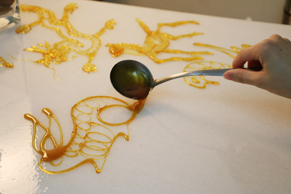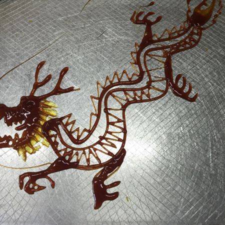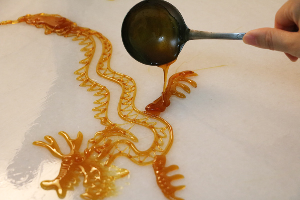 Sugar painting is a traditional Chinese folk art using hot, melted sugar. Our really talented sugar artist creates food sculptures by drizzling the melted sugar onto white marble or metal. Starting with a thick outline the sugar artist can create a large variety figures. Staple Chinese folk art figurines are a dragon, phoenix and rabbit. The final stage of the food sculptures involves attaching a thin wooden stick so the customer can hold it.