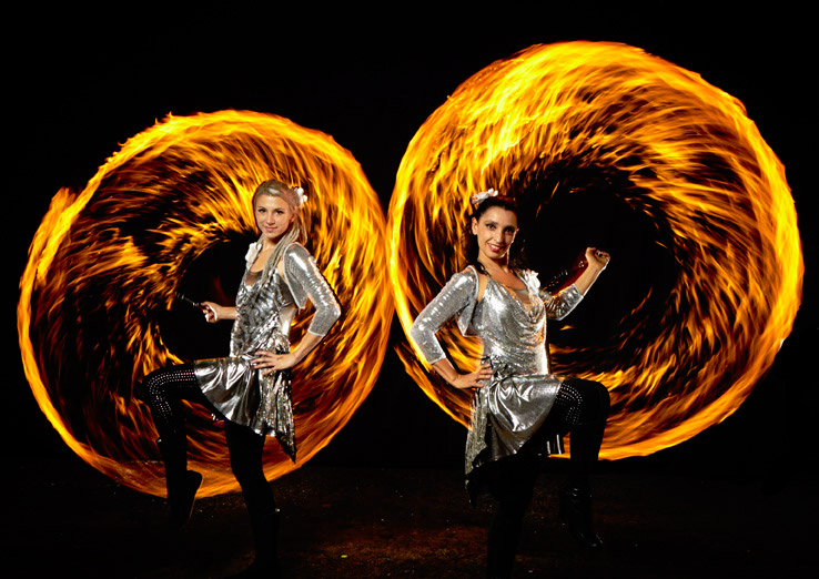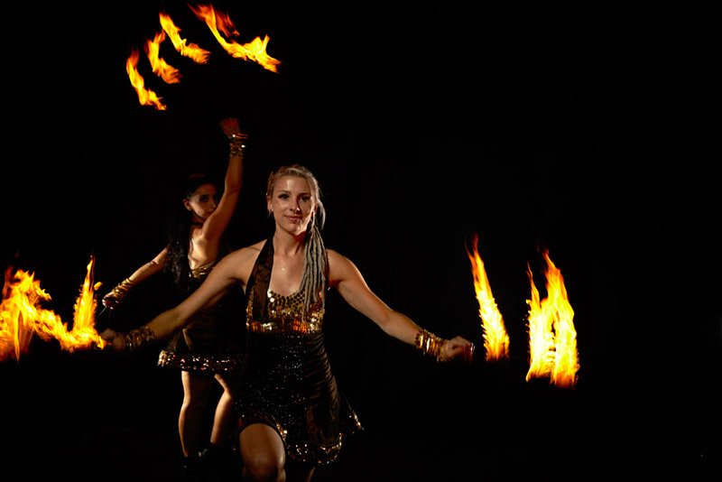 Our professional fire dance duo is a stunning sight with their glamorous, alluring costumes and incredible flaming props. Guests will be awestruck as our fire spinners deftly wield their burning props and create striking shapes and patterns with the dancing flames. This spectacular fire show features smooth and skilful dance choreography as our two dancers weave and spin, creating a breath taking fusion of graceful motion and glittering flame. Our fire dance is Australia’s most dazzling and alluring fire act and is a popular choice of entertainment for all kinds of events.