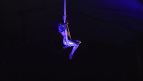 Audiences will watch in amazement as she flies, drops, spins and soars through the air performing daring aerial acrobatics. Twirling through brightly colored flowing silks, fast spinning ropes, and contorting her body into impossible poses on bungees, lyra, aerial hammock, Spanish web, net, straps and creative apparatus including a triangle, moon, star and birdcage.