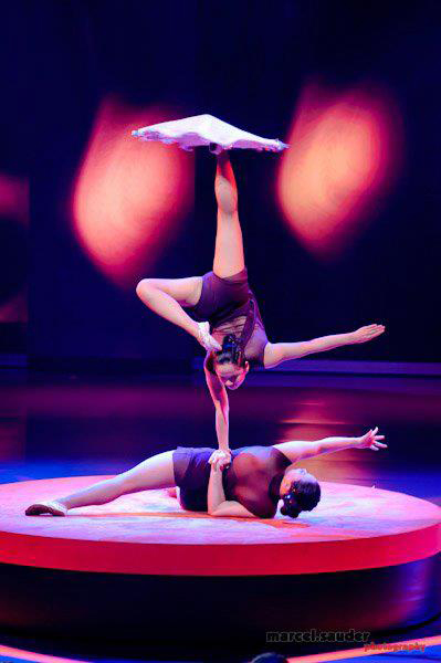 Spectacular display of superhuman flexibility, strength and coordination executed by two perfectly synchronised acrobats