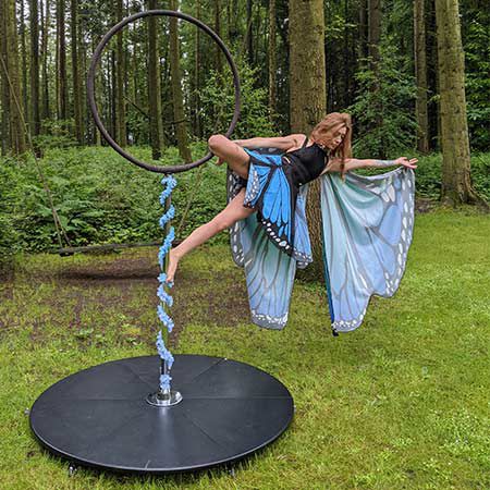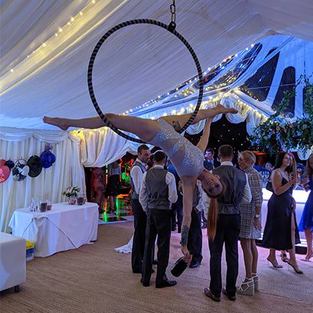 The ultimate choice for any event, our aerial artist can perform on a rigged hoop, aerial silks or Lollipop Lyra for events without aerial rigging