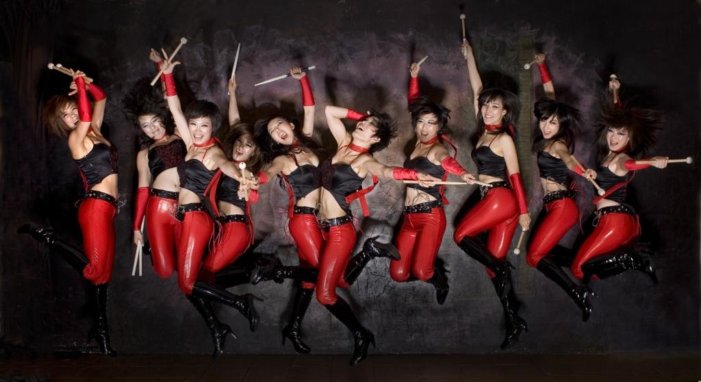 Beautiful girl drummers in skin-tight cat suit and hair –flickering to drumming, breathtaking bash of drums, and timely effective background music will amaze the audience throughout the entire show.