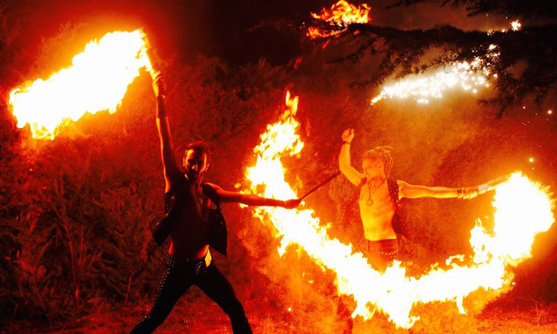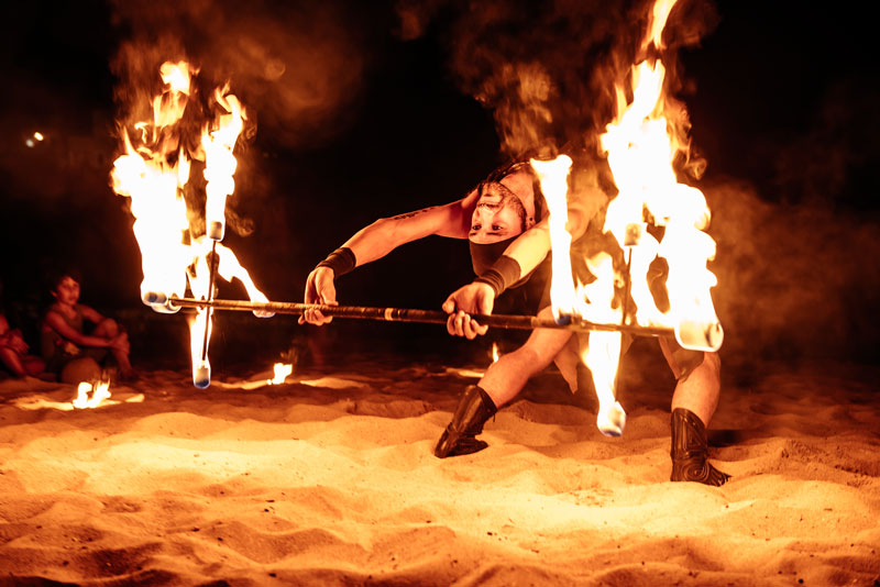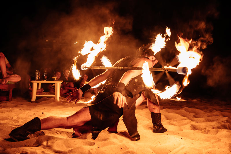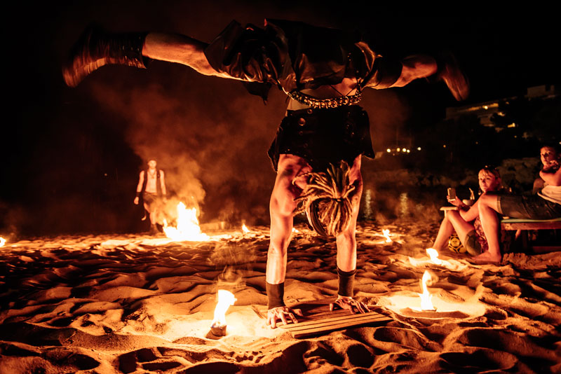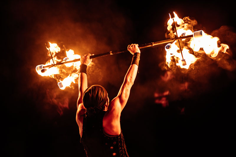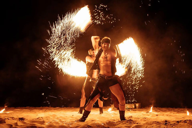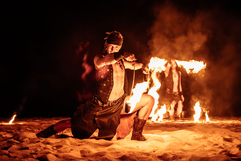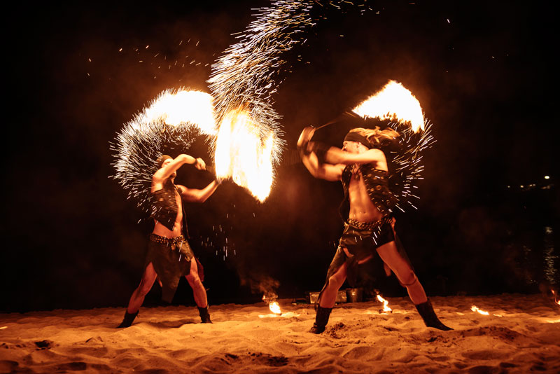 Dressed as fierce warriors, our fire dancers and acrobats camouflage themselves at night with fully black outfits or shine and add light to their performance with their white costumes. Whatever the occasion, they will be happy to share their ideas with you and help you make a final decision when it comes to customisation options.