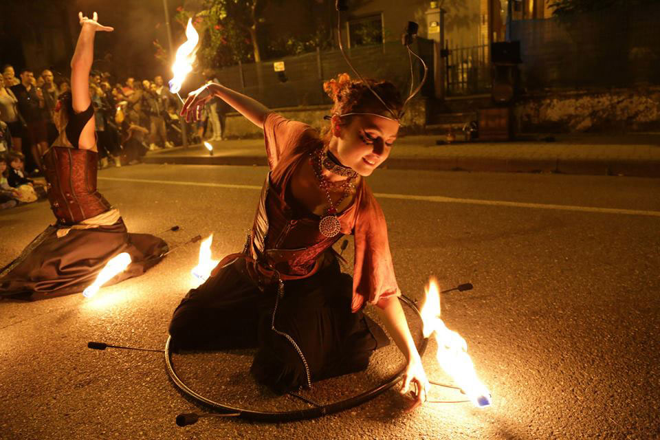 Their fire show can also take the form of a comedy with two characters bickering as they try to make their way back to their stranded airship… with lots of fire tricks along the way!