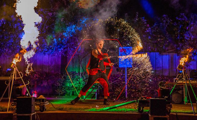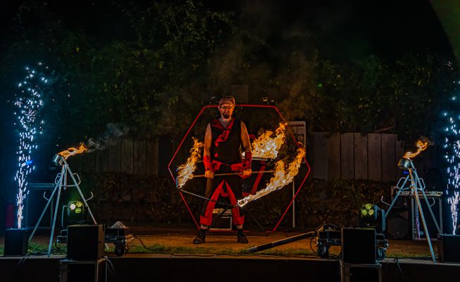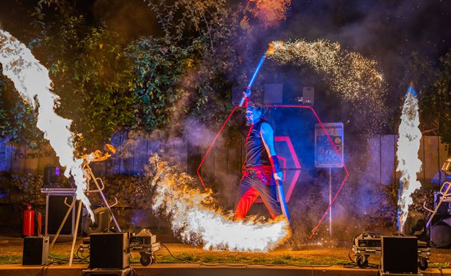 His performances feature a dynamic mix of fire acts, from fire dance and flame projectors to sparklers, ideal for creating dramatic reveals