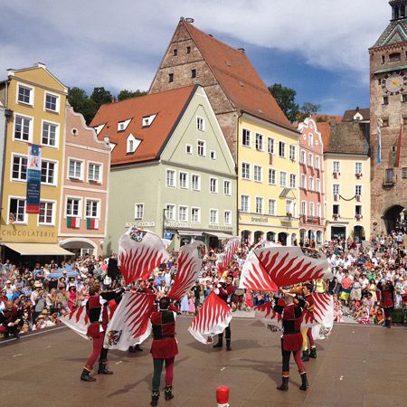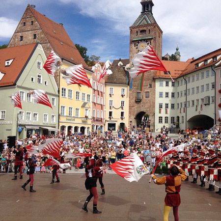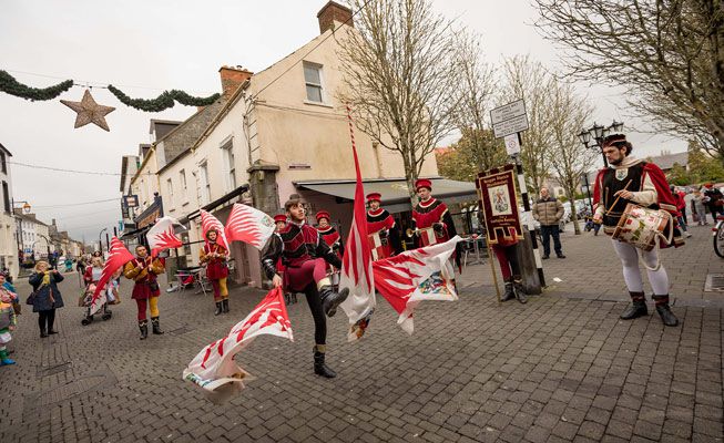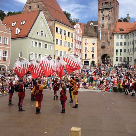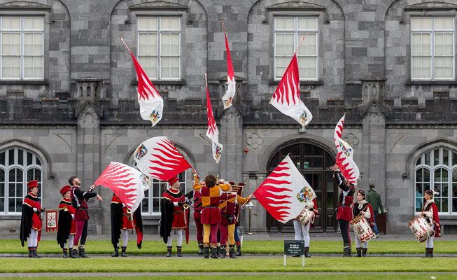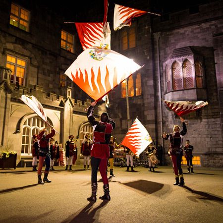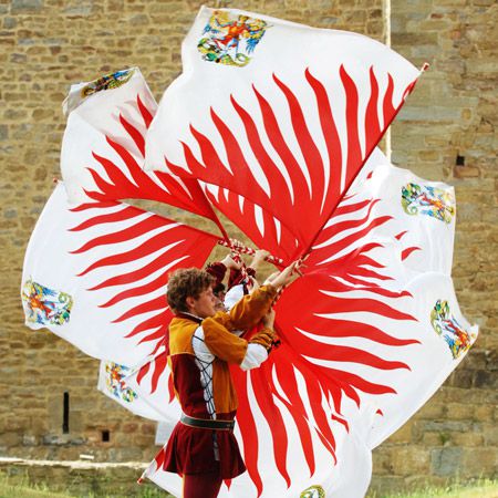 Our esteemed flag waving team consists of 12 people; 6 flag wavers, 3 medieval drummers and 3 medieval trumpeters