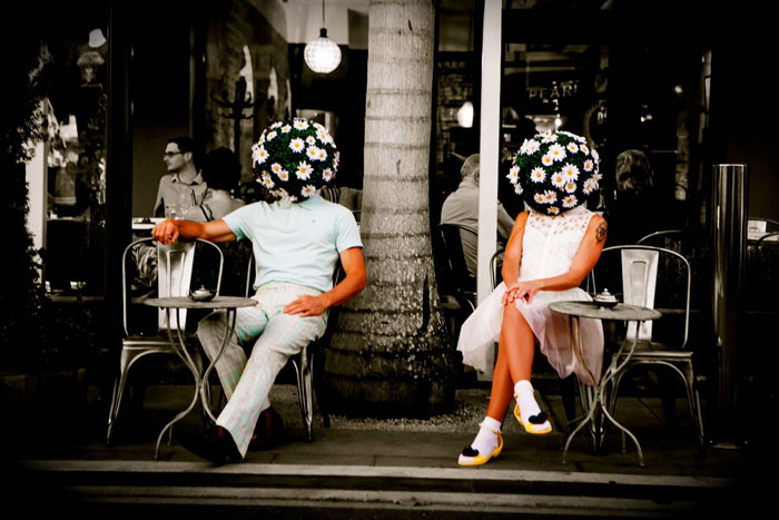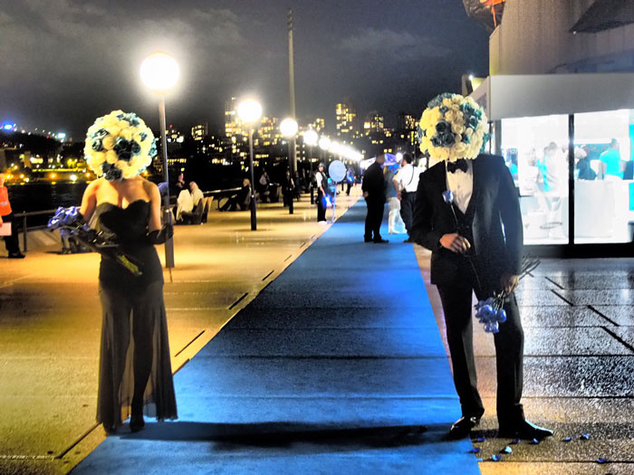 The Flower Head People are an elegantly dressed male and female couple with colourful head masks made of scented flowers. Their routine is as much a walkabout act as it is a visual performance. The couple, whether walking or dancing, move at around a third of the normal speed. It is a unique act that is minimalist and surreal. It is odd and elegant. When not mingling with your crowd, the Flower Head People will act as a background spectacle dancing to themselves, even if there is no music. The rest of the time they will strike a pose and hold it just like a living work of art.