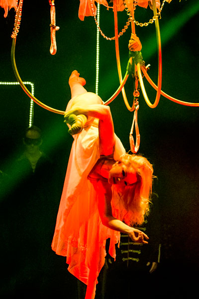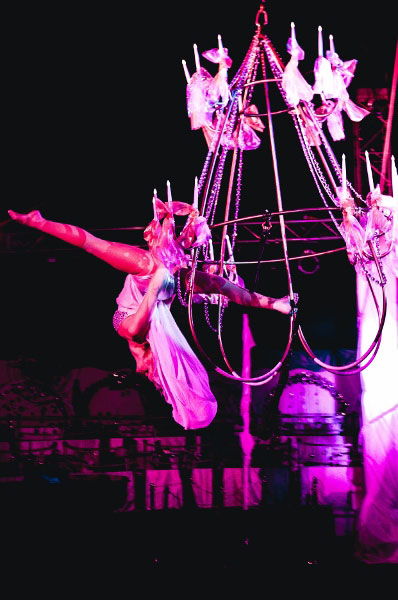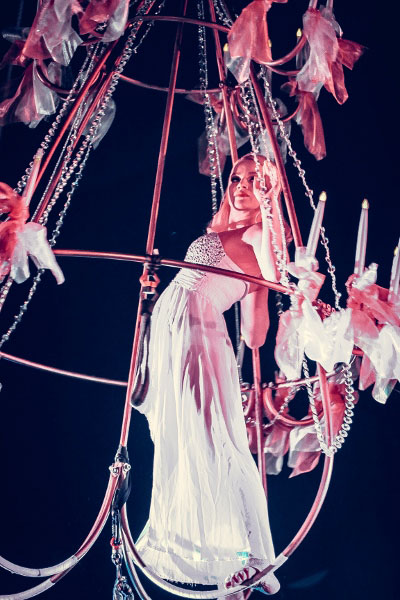 Hung from an oversized chandelier, or aerial artist will perform a captivating choreography high in the air. Dressed in a beautiful and elegant evening gown, our chandelier aerial dancer will perform a routine that includes impossible figures and moves and that requires elasticity, physical strength and great concentration. Luminous candles and flashing crystals will create a sophisticated atmosphere and will make our chandelier aerial dancer shine even brighter.