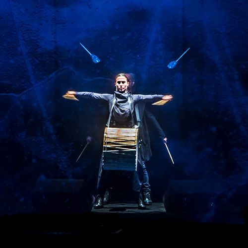 Using the latest video mapping techniques, dynamic visuals rapidly change to match the emotions of the performers below